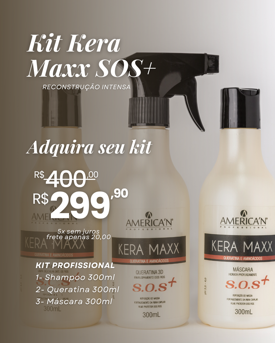 Diariamente, os cabelos são expostos a diversos danos de origem química ou agressões físicas. Dessa forma, os fios vão perdendo massa, tornam-se quebradiços, opacos e sem vitalidade. Pensando nisso, a America’n Professional criou a linha Kera Maxx S.O.S+ foi especialmente desenvolvida para tratar profundamente os fios, nutrir, promover reposição de massa, e repor os aminoácidos essenciais aos cabelos. Composta por ativos multifuncionais que recuperam lesões extremas, protegem, cauterizam e blindam as cutículas. Enriquecida com queratina e nano aminoácidos que atuam preenchendo as falhas do cimento intercelular e do córtex, trata a estrutura dos fios de dentro para fora proporcionando uma coesão celular, aumentando a resistência e brilho dos cabelos.
